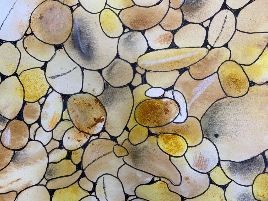 8. Once your paper has dried, take your pencil and follow the outlines of colour and shapes you see on the page. Draw your lines as pebble shapes. These can be as knobbly and random as you like, and close to each other, just as you’d find on a beach!