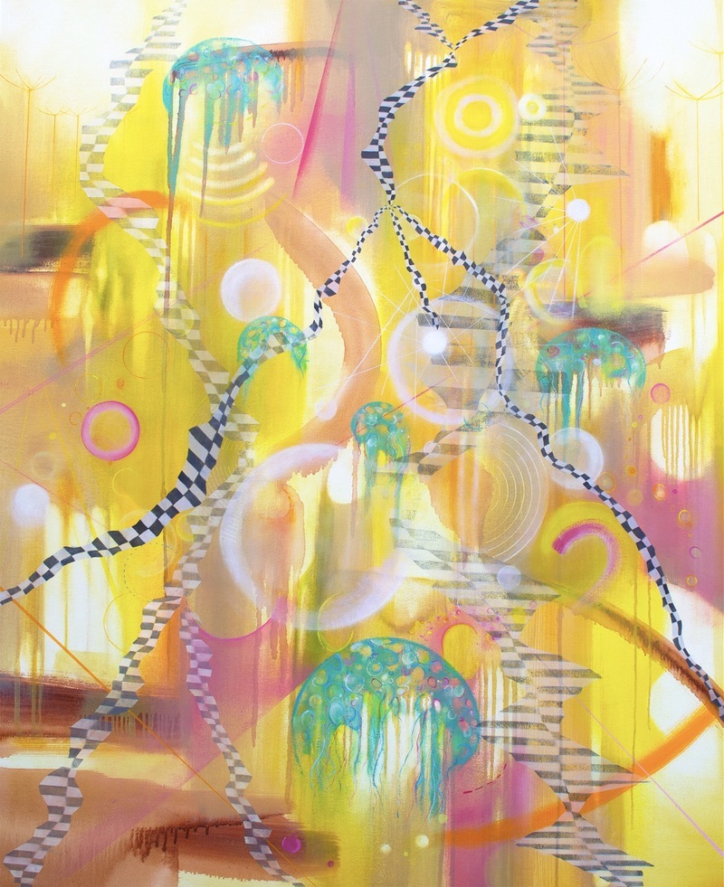 Maybe the turquoise shapes are Jellyfish, or Peacocks, or both, or neither. I was thinking of invisible threats and the fragility of our equilibrium and ecosystem, and how potentially oncoming, significant changes to our world, might mean that we eventually exist just outside the current goldilocks zone.
