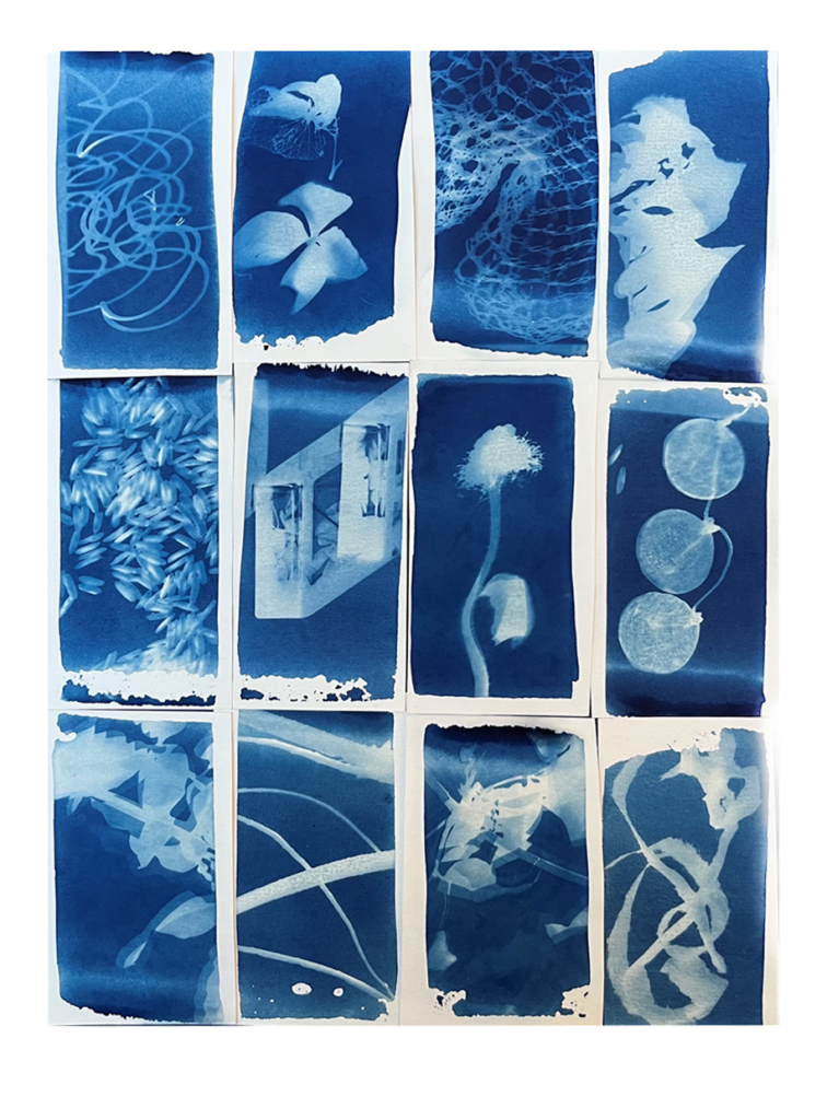 Processing (2023), cyanoytpe prints with found objects