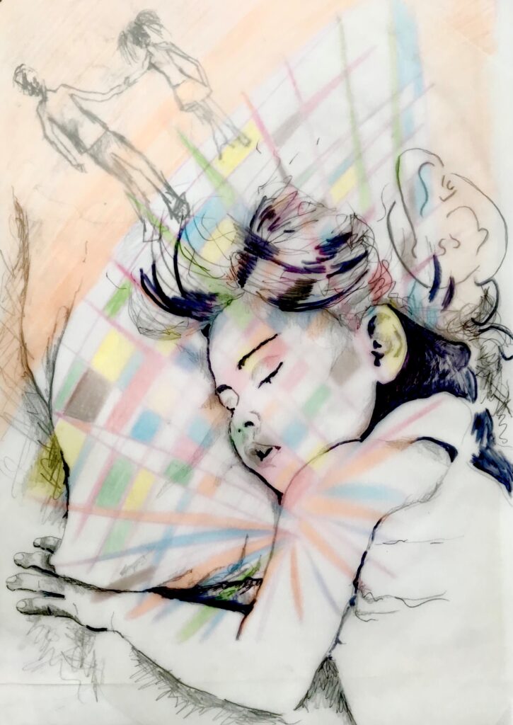 Pillow for Children (2022), colour pencil, graphite, translucent paper, brush and fine line pens
