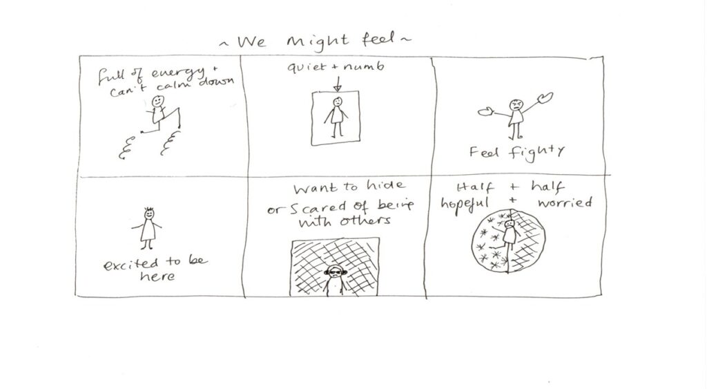 One of the many ways I approached this was through drawing comics; each one was used to communicate ideas about the dynamics of human relationships (Heard, Lake and McCluskey, 2012). Our weekly art therapy and attachment group started with a grounding exercise and check-in, after which I would introduce a new comic. The first one explored what we might experience when joining a group and ways in which critical judgements might get in the way of working with the art materials.
