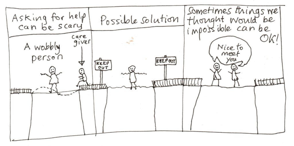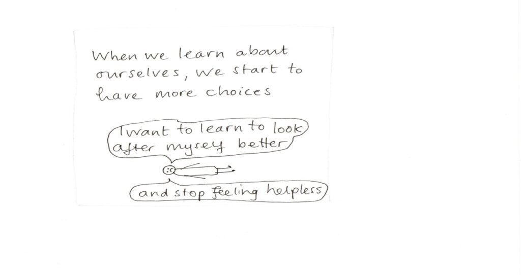 Over the weeks we worked from comics about care seeking, care giving, self-defence, interest sharing, intimacy, the internal supportive or unsupportive environment and the external supportive or unsupportive environment. The group included time for art-making and sharing images and associations to the material I introduced. Here are some quotes from the group: